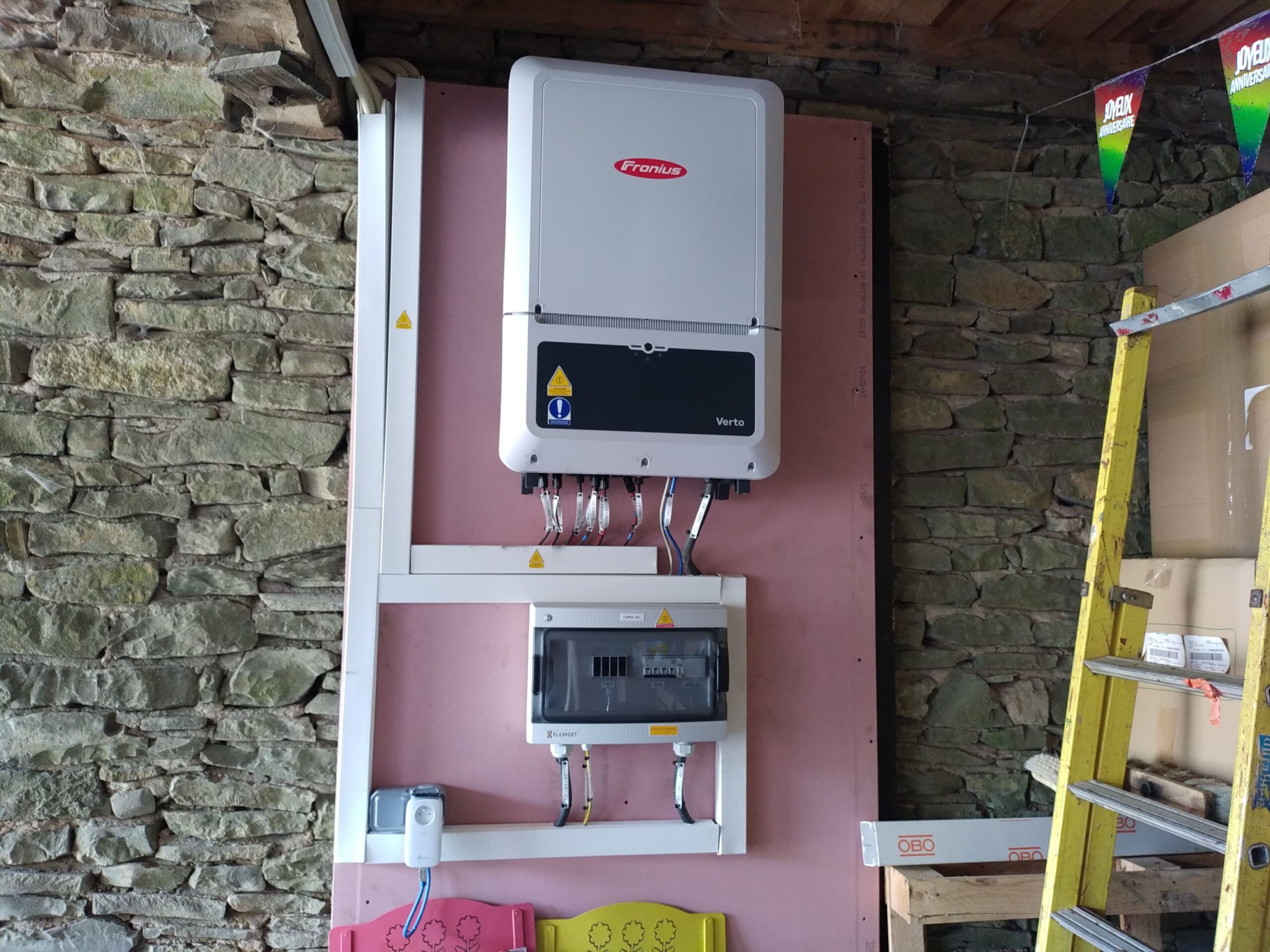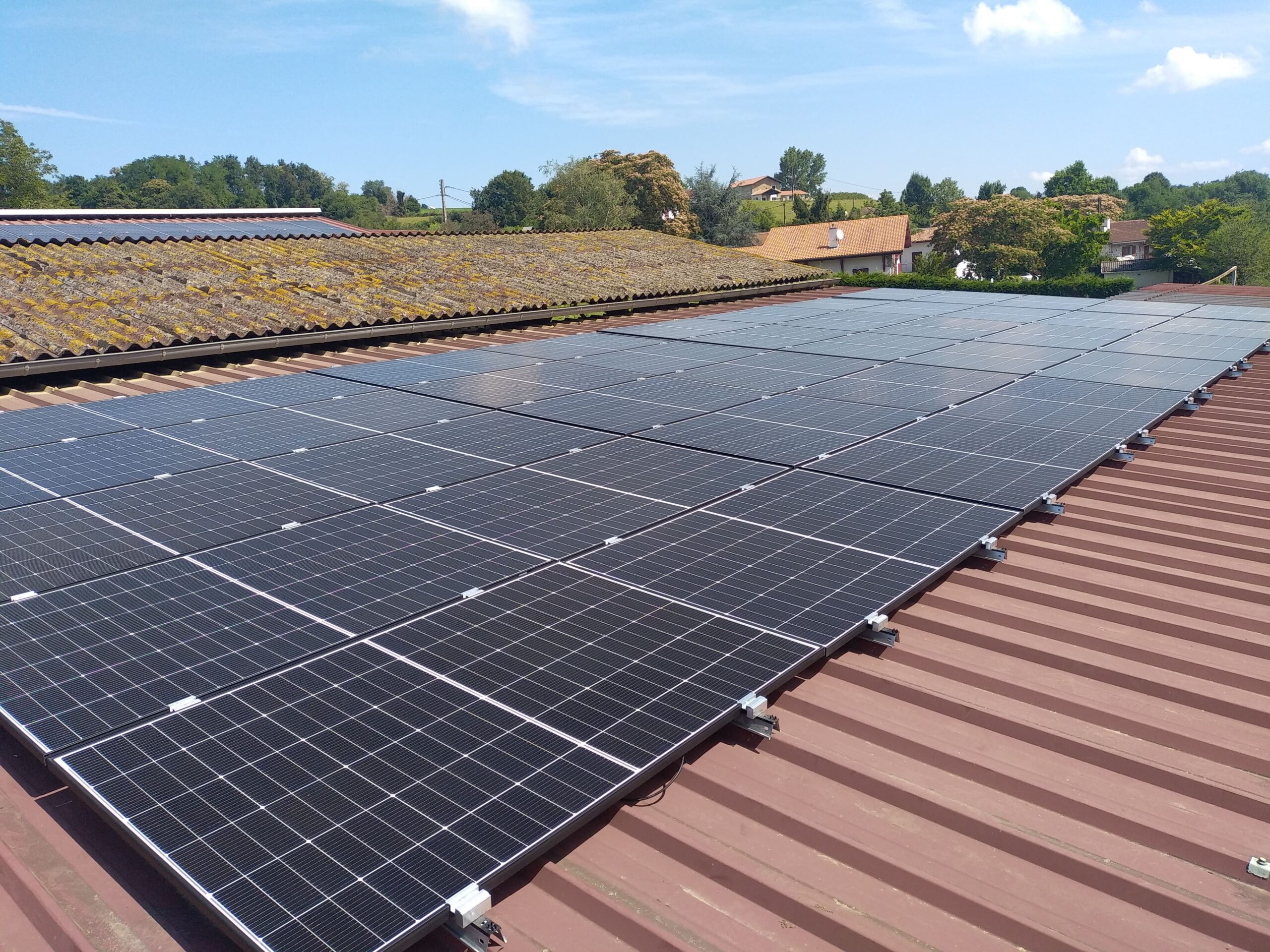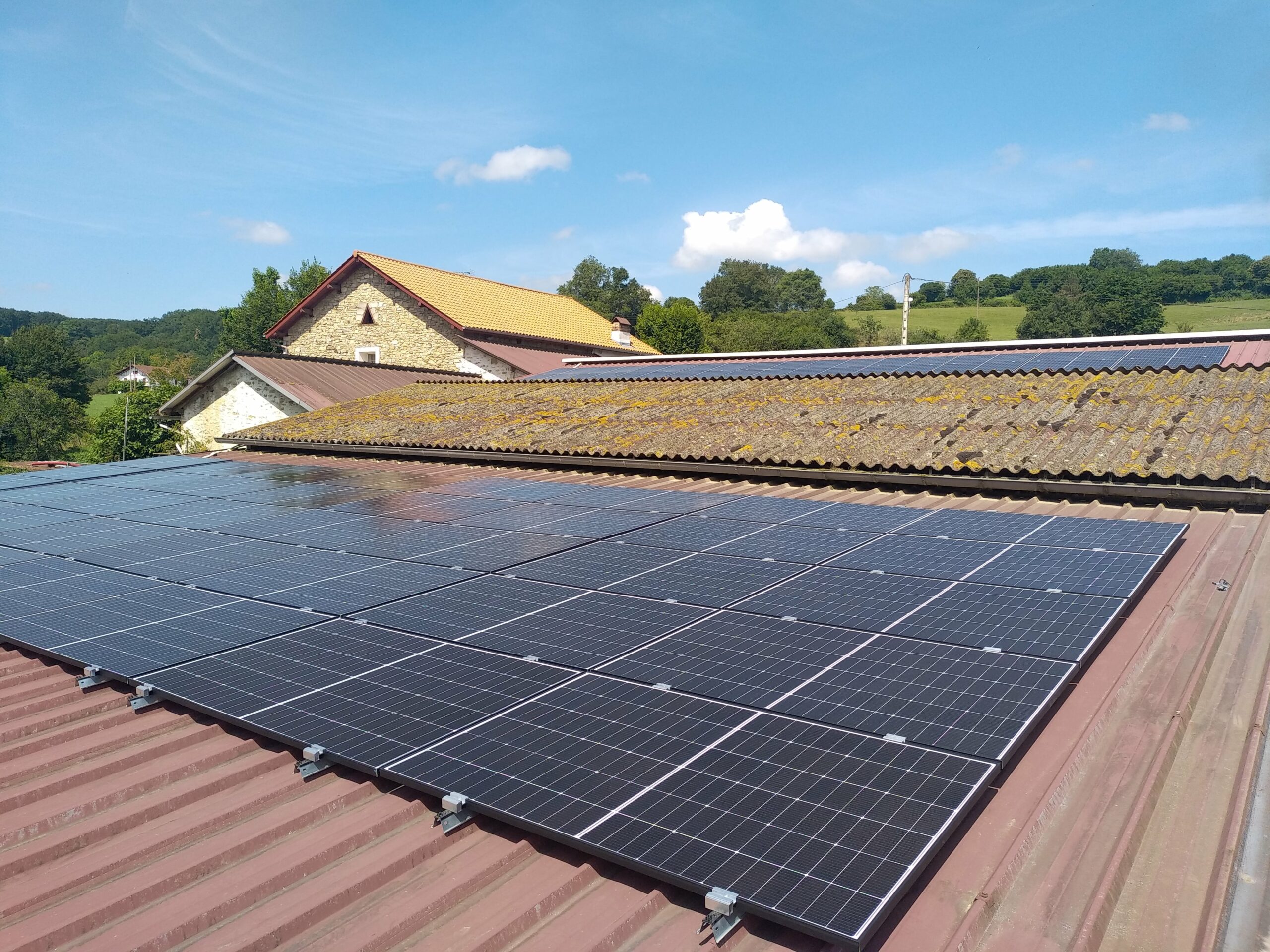 Installation photovoltaïque de 36Kwc en autoconsommation avec vente de surplus pour une exploitation agricole située à Beyrie sur Joyeuse. 80 panneaux d’une puissance de 450Wc posées sur un bac acier exposée Sud-Est avec un onduleur central et un système de suivi de la production et de consommation.
